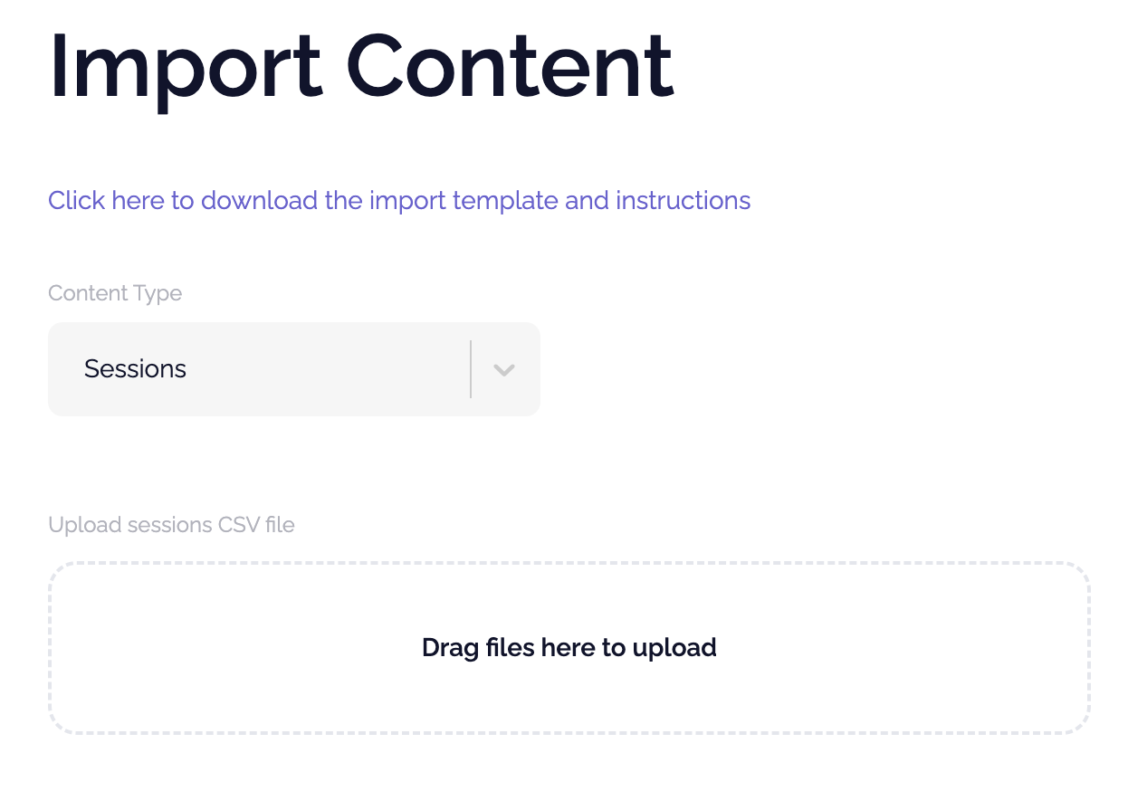 We allow importing for sessions, speakers, sponsors, attendees, and push notifications. If you go to Content > Import you will see the import template, or you can create a copy of the template here.