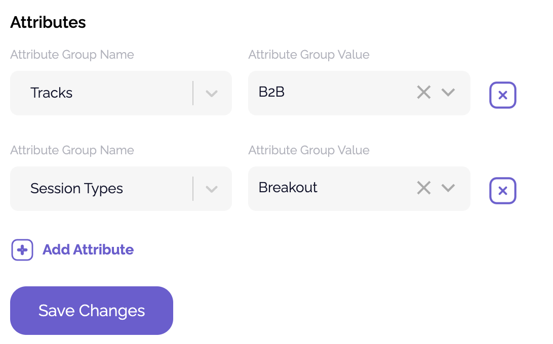 Attributes are selected on the Attributes tab of the session. These are shown in Filters on the library and allow attendees to shrink the list of content in the app library:
