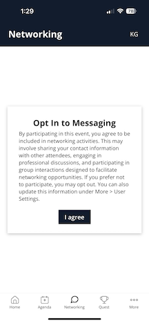 - Require Opt In - Uses the opt in text below (which can include your terms and conditions) to force each attendee to opt into networking, chat, and meetings, or not.